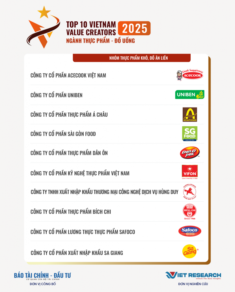 CÔNG BỐ TOP 10 DOANH NGHIỆP TẠO GIÁ TRỊ HÀNG ĐẦU VIỆT NAM 2025 – NGÀNH THỰC PHẨM – ĐỒ UỐNG
