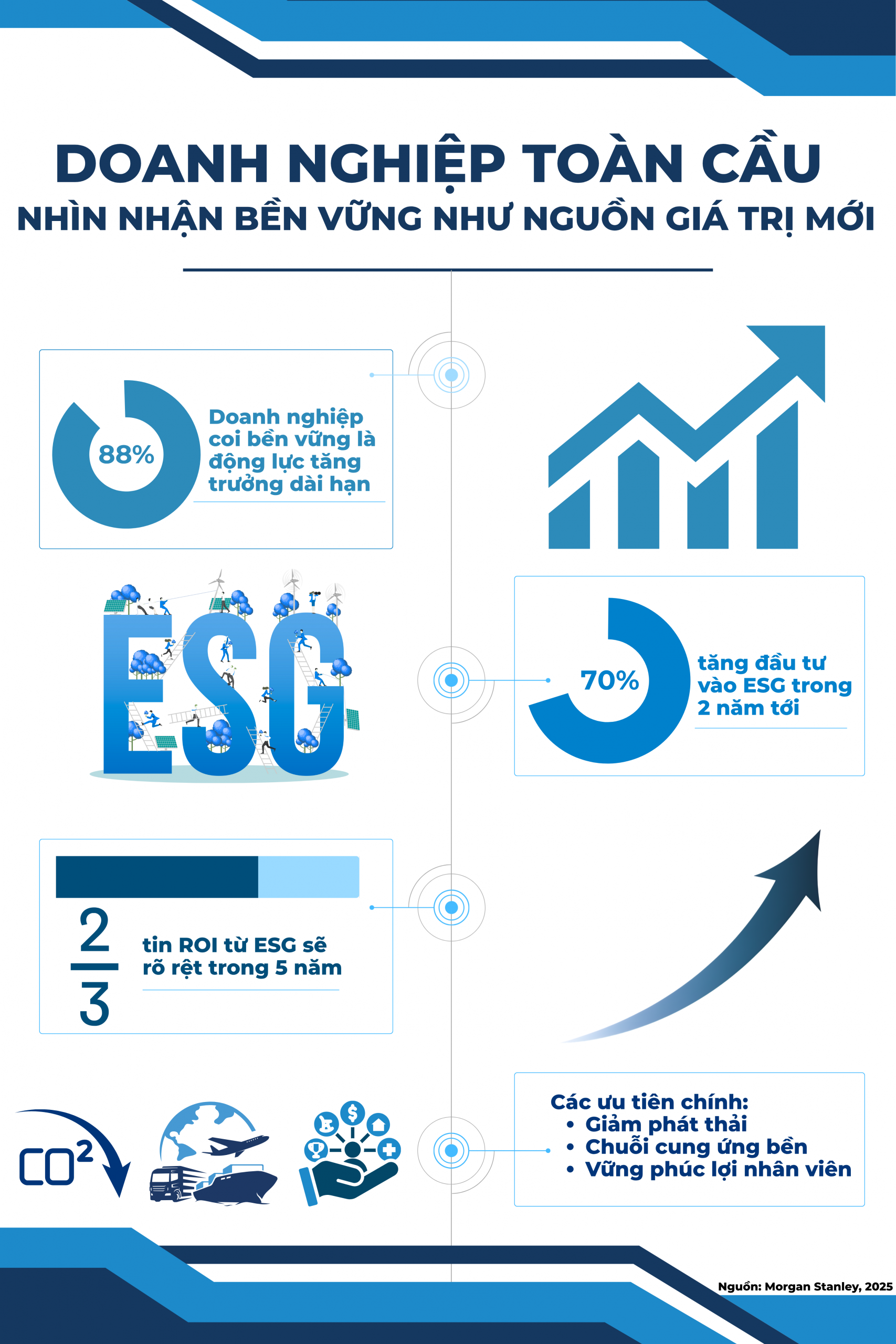 Một báo cáo mới đây của Morgan Stanley – một trong những định chế tài chính lớn nhất thế giới – cho thấy 88% doanh nghiệp toàn cầu coi bền vững là động lực tăng trưởng dài hạn. Con số này phản ánh rõ sự thay đổi trong nhận thức: ESG không còn là khẩu hiệu, mà là chiến lược sống còn để gia tăng giá trị cho cổ đông, người lao động, khách hàng và cộng đồng.