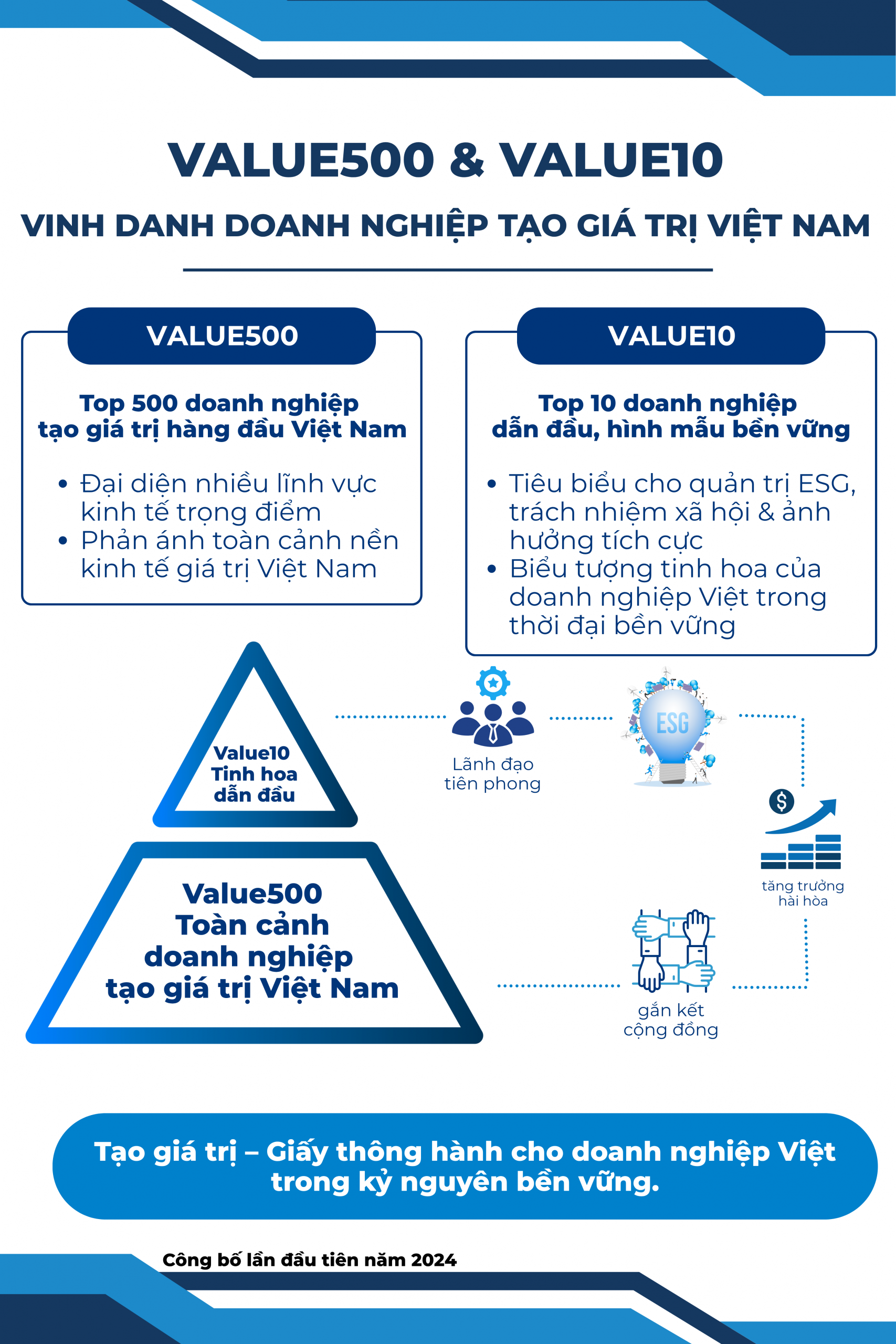 Nếu như Value500 sẽ là bức tranh toàn diện nhất về 500 doanh nghiệp Việt Nam tạo giá trị nổi bật, đại diện cho nhiều lĩnh vực then chốt của nền kinh tế thì Value10 tập trung vinh danh 10 doanh nghiệp dẫn đầu, là hình mẫu về quản trị bền vững, trách nhiệm xã hội và năng lực tạo ảnh hưởng tích cực cho cộng đồng trong các ngành kinh tế cụ thể. Việc công bố hai bảng xếp hạng này mang nhiều ý nghĩa như: