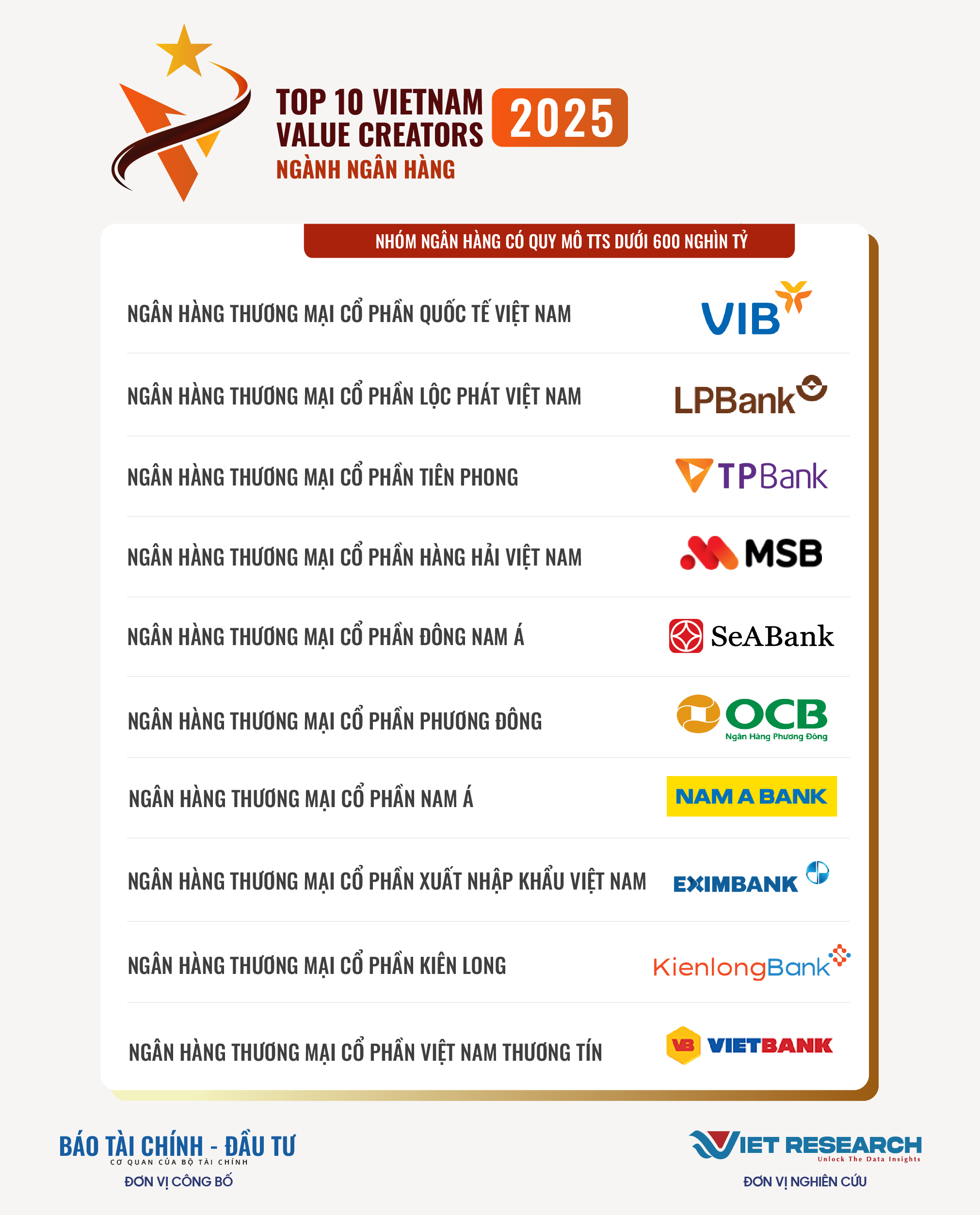 Trong khuôn khổ Chương trình Nghiên cứu toàn quốc về các Doanh nghiệp tạo giá trị hàng đầu Việt Nam, Viet Research phối hợp với Báo Tài chính – Đầu tư (Bộ Tài chính) công bố Top 10 Ngân hàng tạo giá trị hàng đầu Việt Nam 2025. Đây là những doanh nghiệp tiên phong trong việc tạo dựng giá trị cho nền kinh tế và xã hội, thể hiện qua: quy mô và tốc độ tăng trưởng; lợi nhuận và đóng góp cho ngân sách; môi trường, chính sách và phúc lợi lao động; cam kết về ESG và đổi mới sáng tạo.