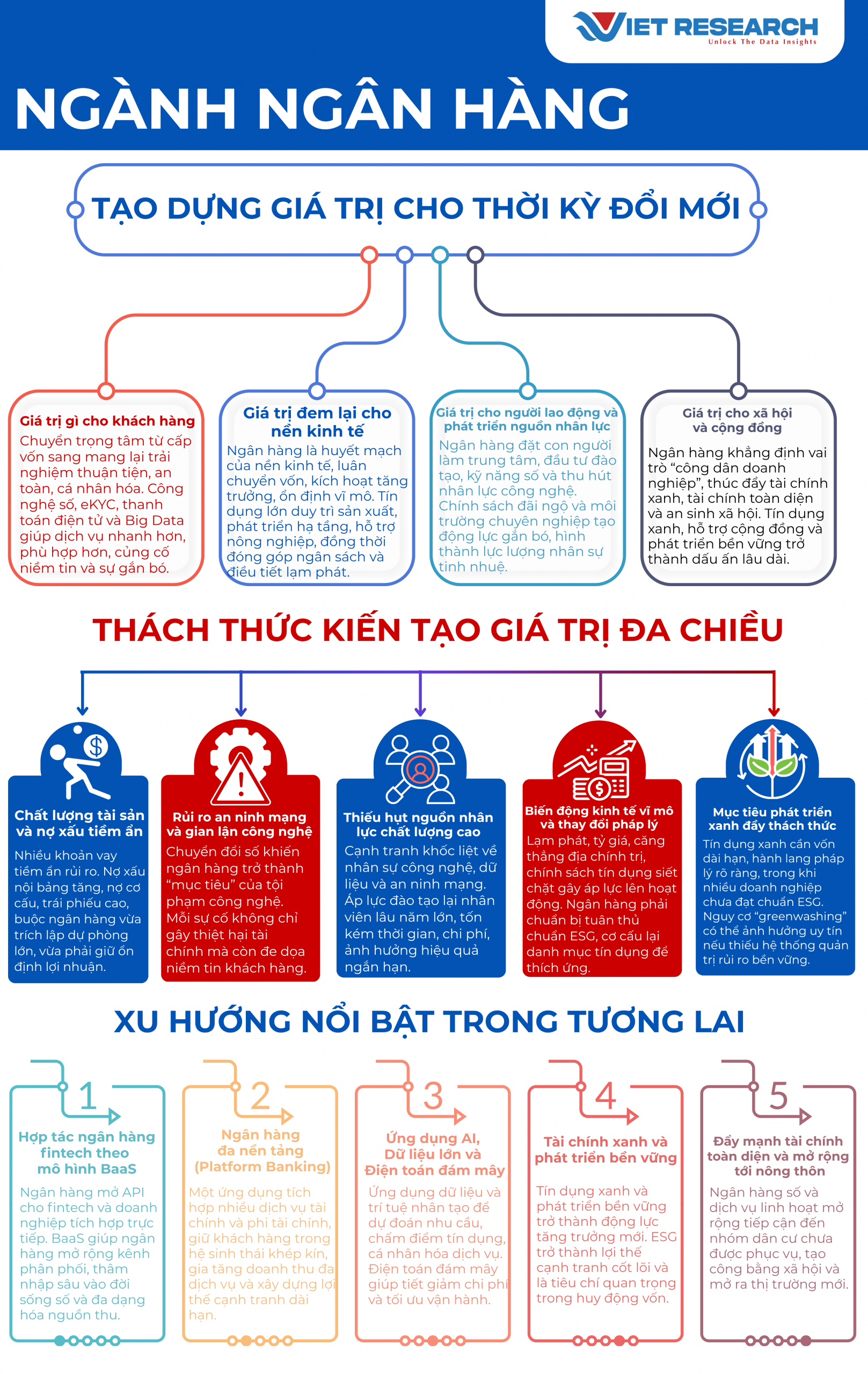 Nhìn về tương lai gần, bức tranh ngân hàng Việt Nam được định hình bởi những xu hướng mới mẻ mang tính chuyển đổi. Giai đoạn 2025–2030 dự kiến sẽ chứng kiến những thay đổi sâu rộng trong mô hình hoạt động ngân hàng. Để tiếp tục tạo giá trị vượt trội, các ngân hàng cần nắm bắt và đi đầu trong các xu hướng này, biến chúng thành lợi thế chiến lược. Có 5 xu hướng chính đang định hình diện mạo mới của ngân hàng trên hành trình kiến tạo giá trị theo khảo sát và nghiên cứu Top 10 Ngân hàng tạo giá trị hàng đầu Việt Nam 2025 của Viet Research.