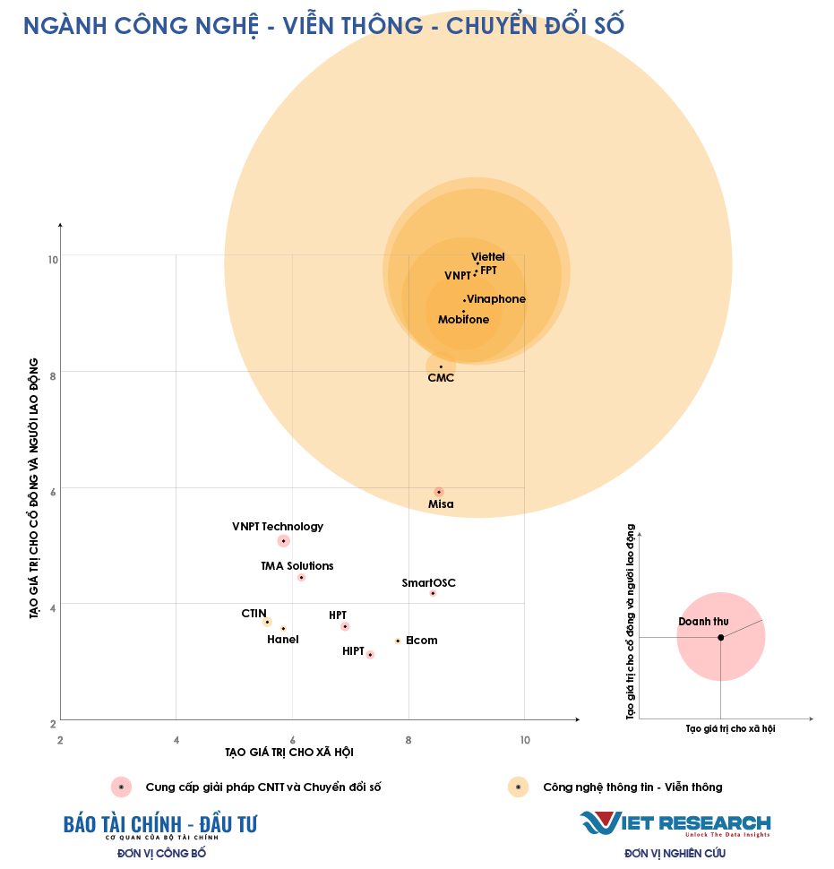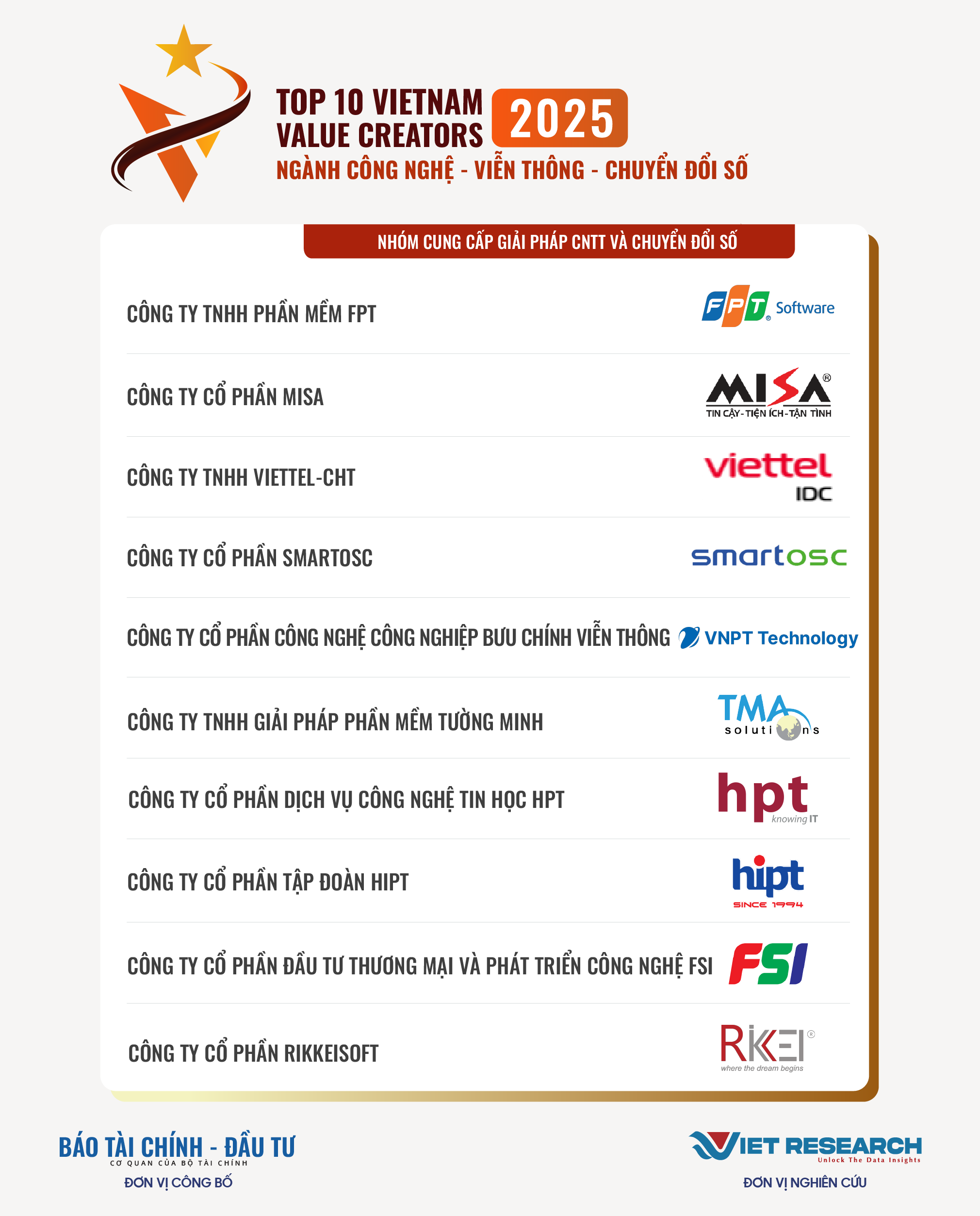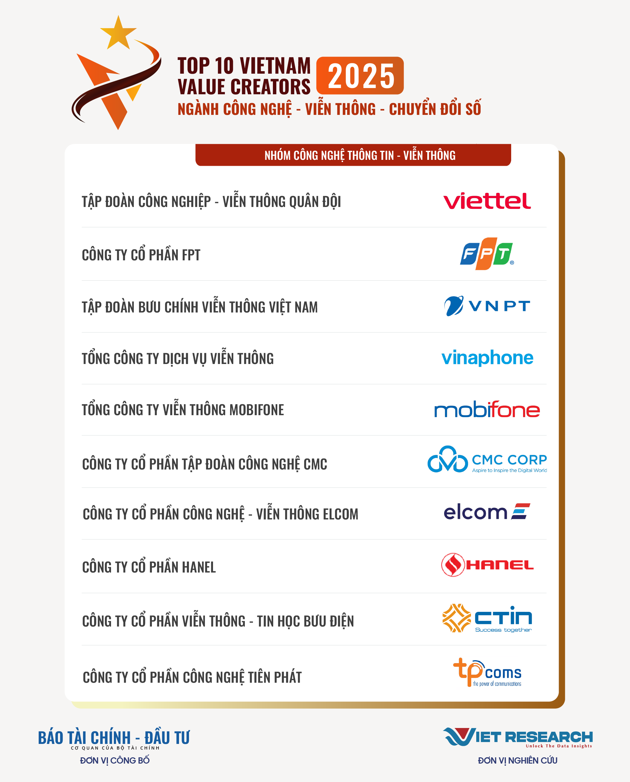 Trong khuôn khổ Chương trình Nghiên cứu toàn quốc về các Doanh nghiệp tạo giá trị hàng đầu Việt Nam, Viet Research phối hợp với Báo Tài chính – Đầu tư (Bộ Tài chính) công bố Top 10 Doanh nghiệp tạo giá trị hàng đầu Việt Nam 2025 – Ngành Công nghệ – Viễn thông – Chuyển đổi số. Đây là những doanh nghiệp tiên phong trong việc tạo dựng giá trị cho nền kinh tế và xã hội, thể hiện qua: quy mô và tốc độ tăng trưởng; lợi nhuận và đóng góp cho ngân sách; môi trường, chính sách và phúc lợi lao động; cam kết về ESG và đổi mới sáng tạo.