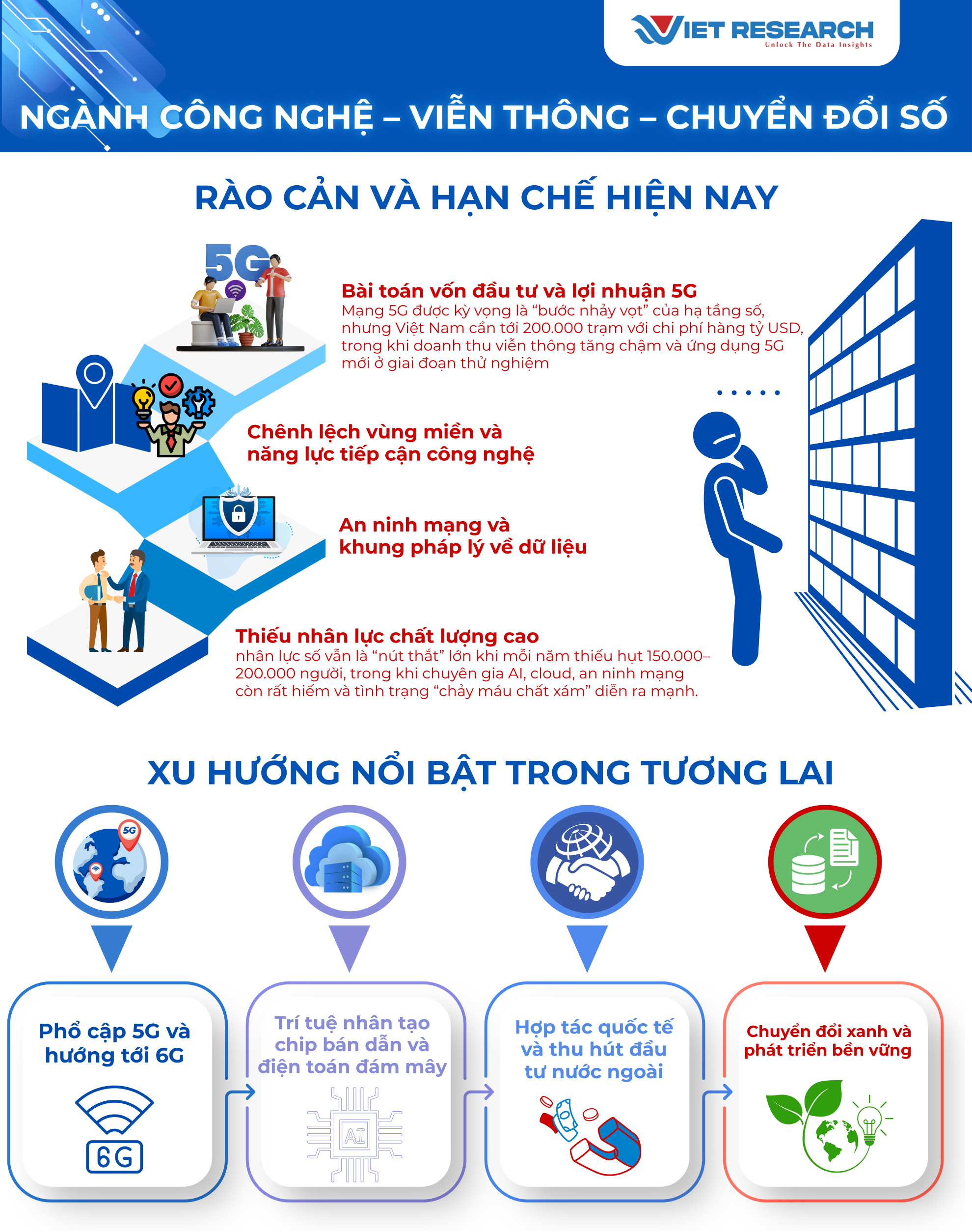 Hoàn thiện khung pháp lý – thúc đẩy đổi mới sáng tạo: Một hành lang pháp lý rõ ràng, minh bạch là nền tảng cho sự phát triển. Việc sớm ban hành Luật Chuyển đổi số, cùng quy định về dữ liệu cá nhân, AI, chia sẻ dữ liệu công – tư, sẽ tạo môi trường an toàn cho đổi mới sáng tạo. Cải cách thủ tục cấp phép tần số, thúc đẩy chia sẻ hạ tầng và áp dụng ưu đãi thuế – tín dụng sẽ khuyến khích doanh nghiệp mạnh dạn đầu tư.