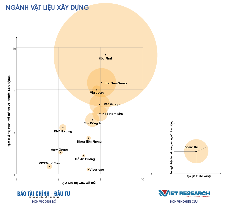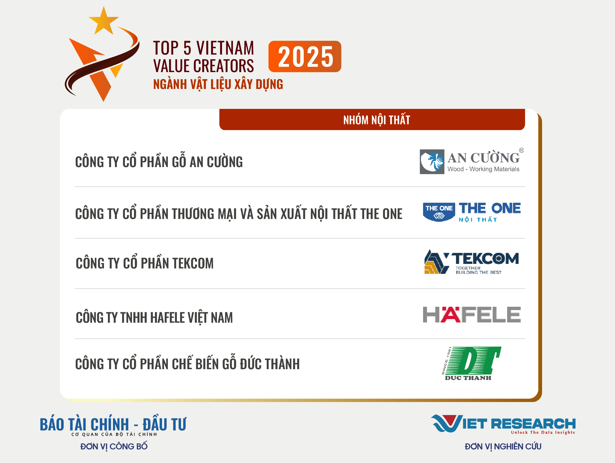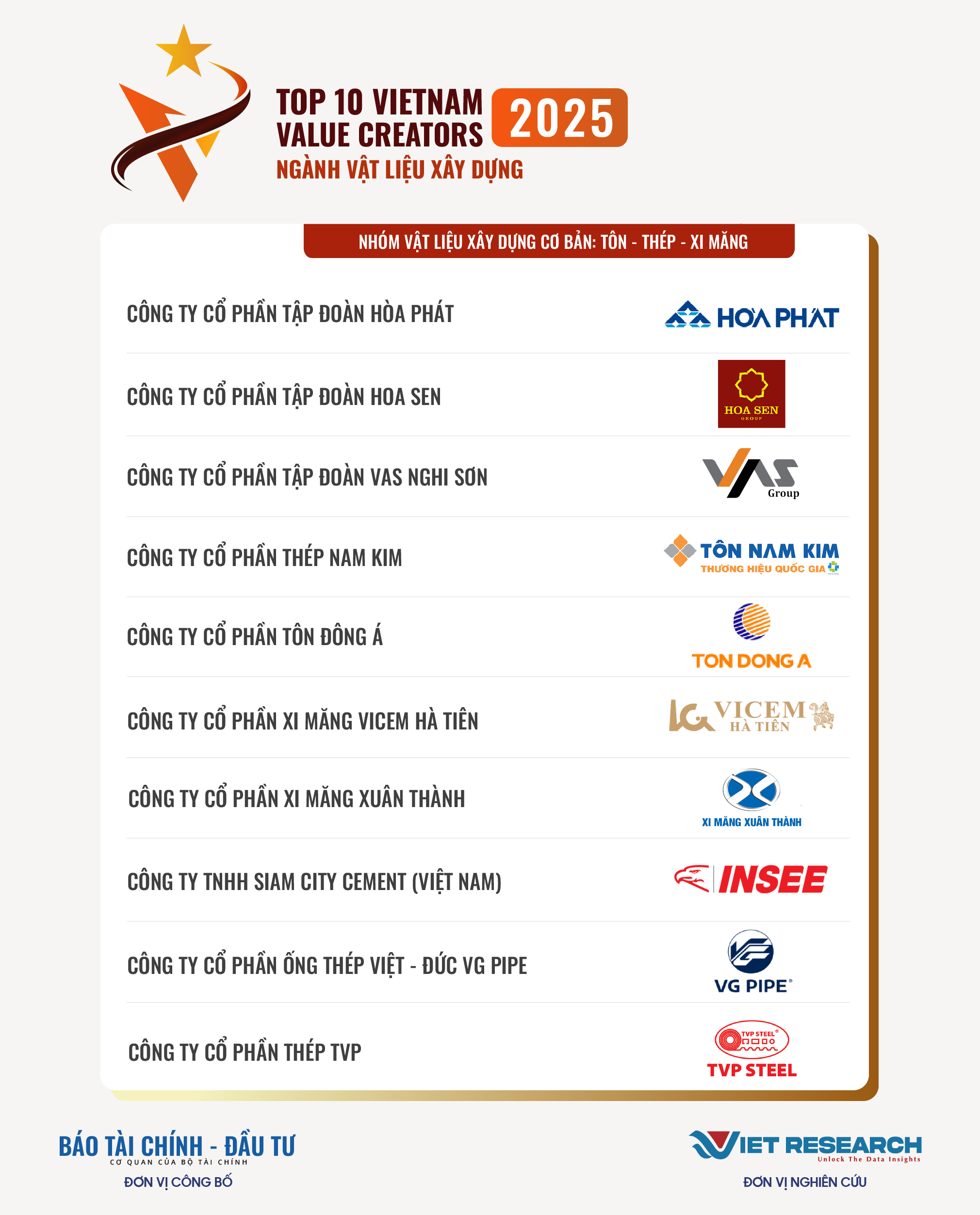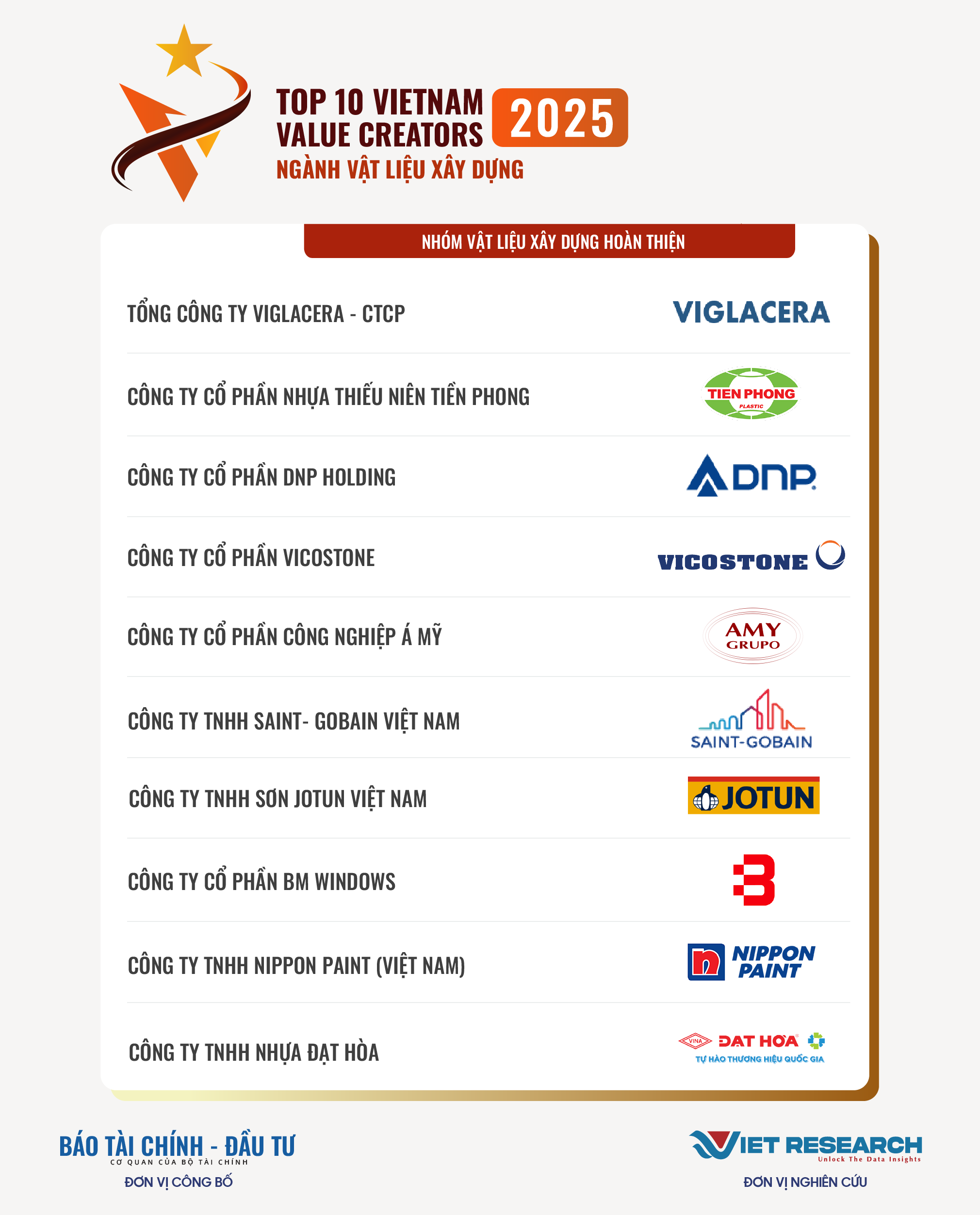 Trong khuôn khổ Chương trình Nghiên cứu toàn quốc về các Doanh nghiệp tạo giá trị hàng đầu Việt Nam, Viet Research phối hợp với Báo Tài chính – Đầu tư (Bộ Tài chính) công bố Top 10 Doanh nghiệp tạo giá trị hàng đầu Việt Nam 2025 – Ngành Vật liệu xây dựng. Đây là những doanh nghiệp tiên phong trong việc tạo dựng giá trị cho nền kinh tế và xã hội, thể hiện qua: quy mô và tốc độ tăng trưởng; lợi nhuận và đóng góp cho ngân sách; môi trường, chính sách và phúc lợi lao động; cam kết về ESG và đổi mới sáng tạo.