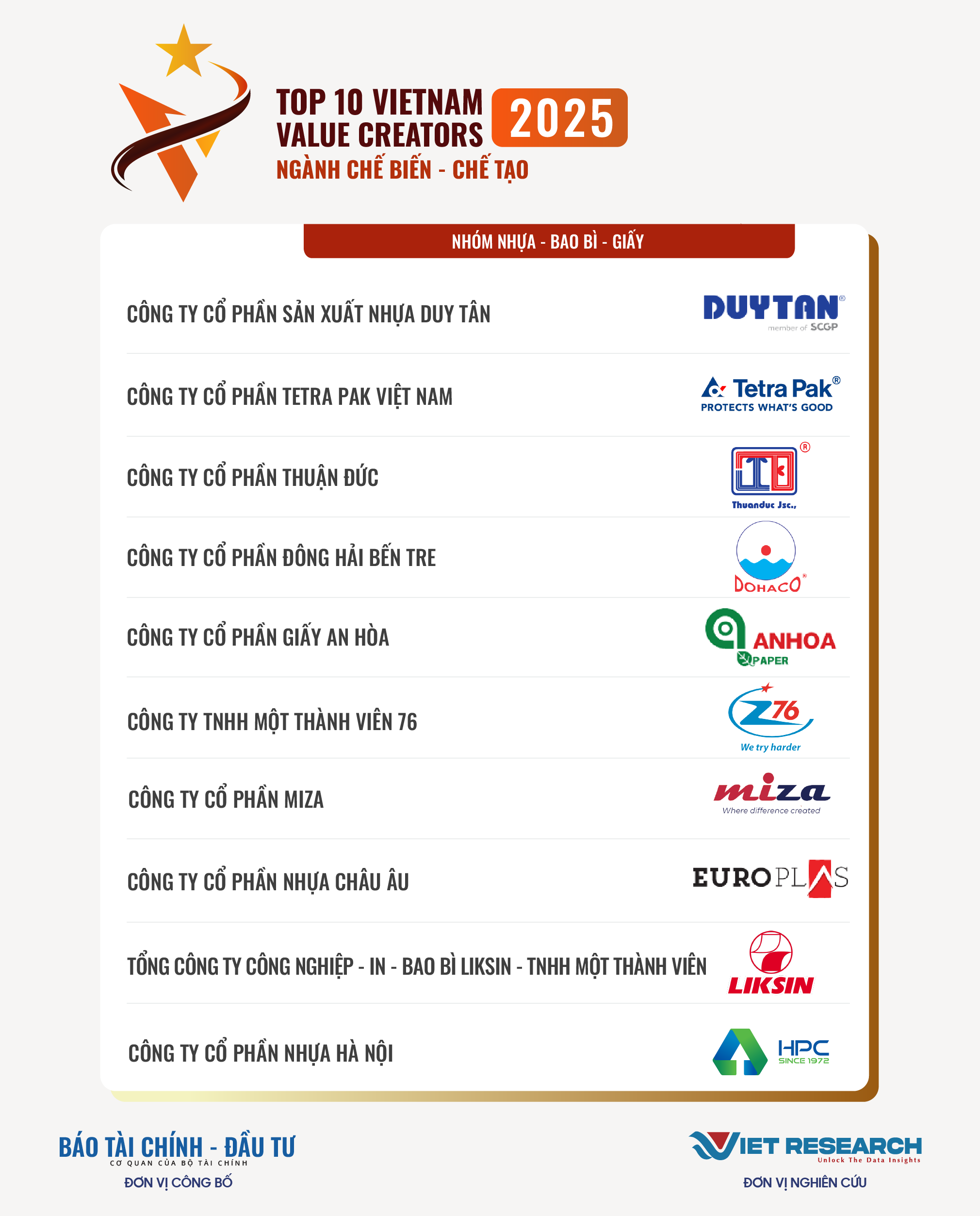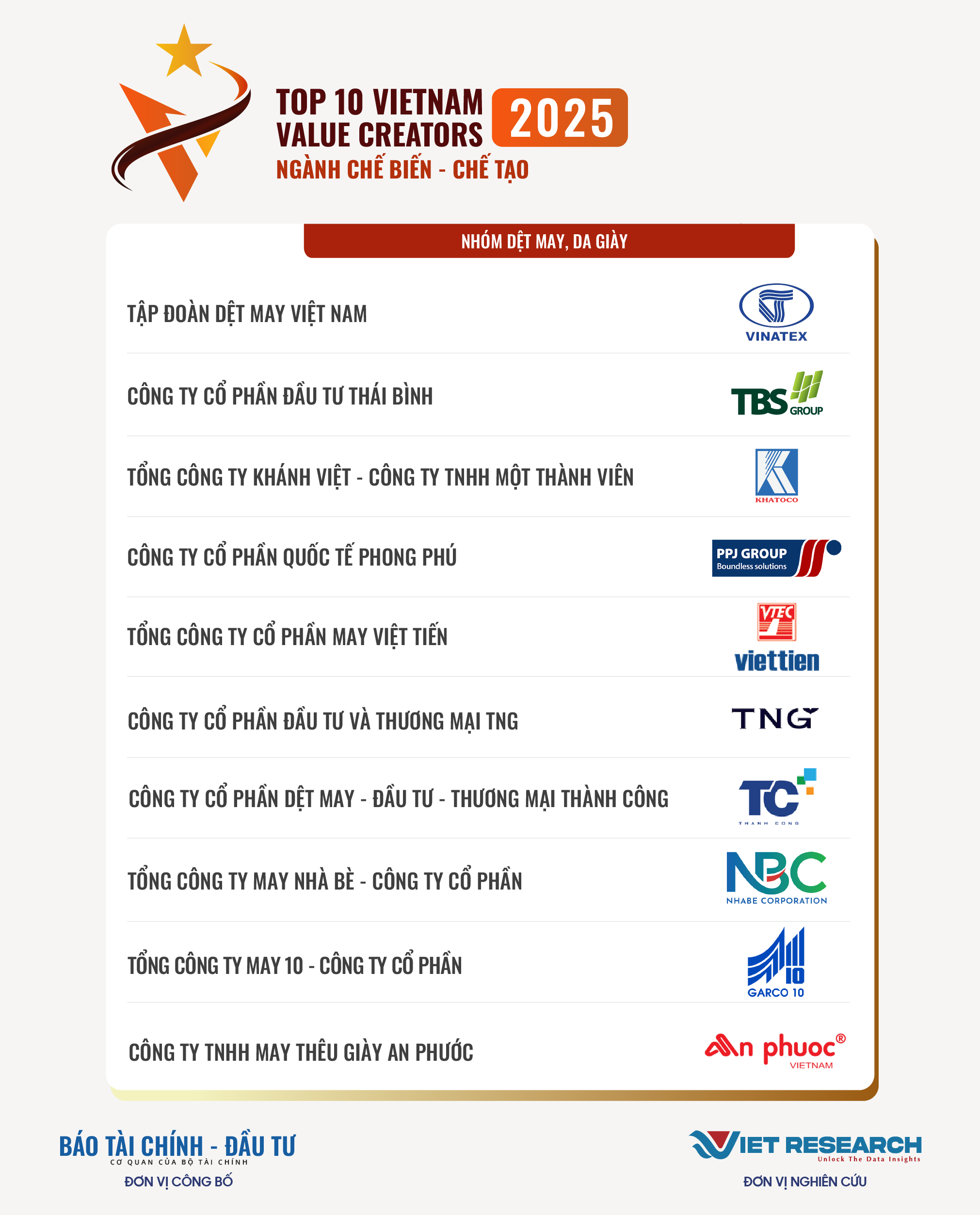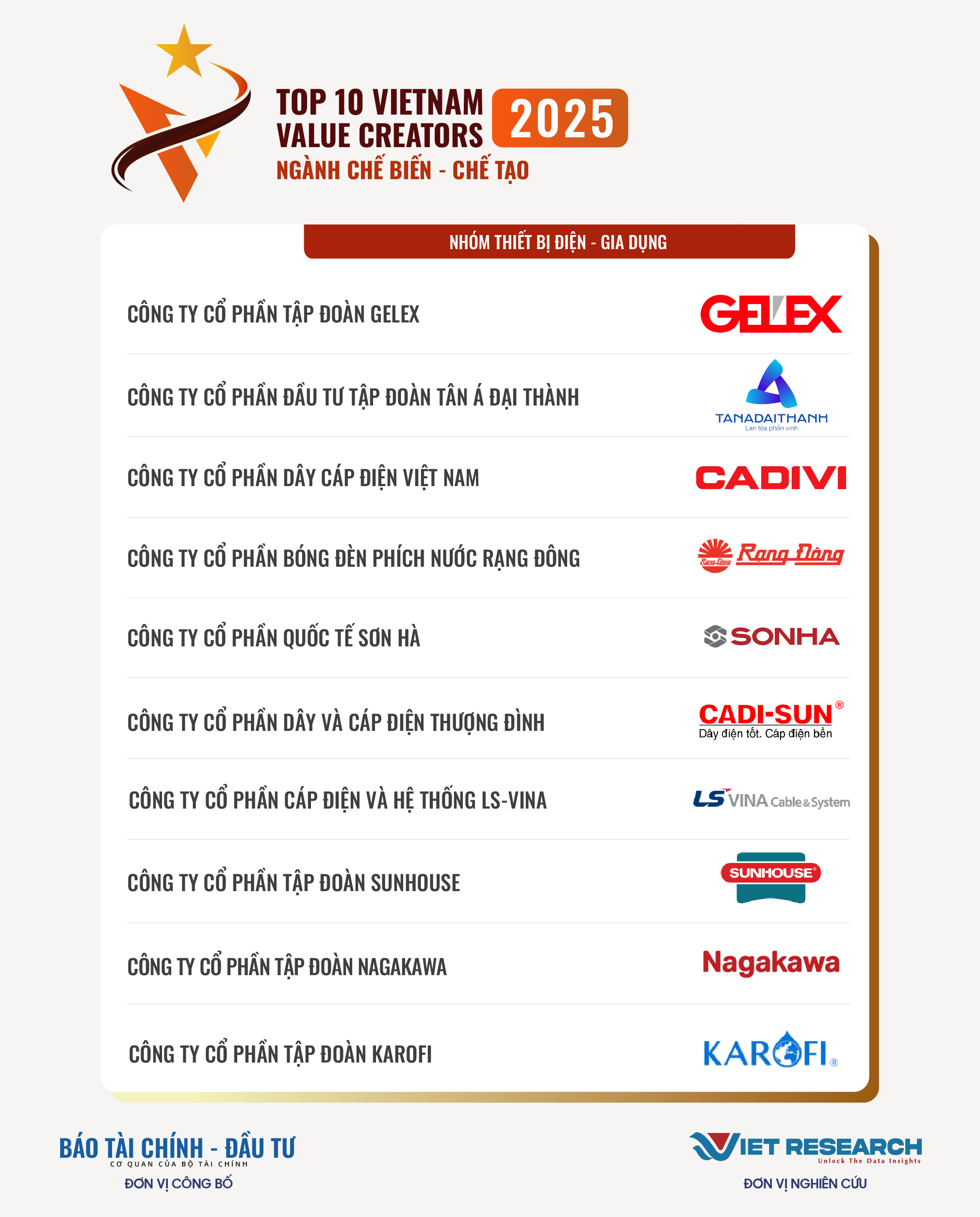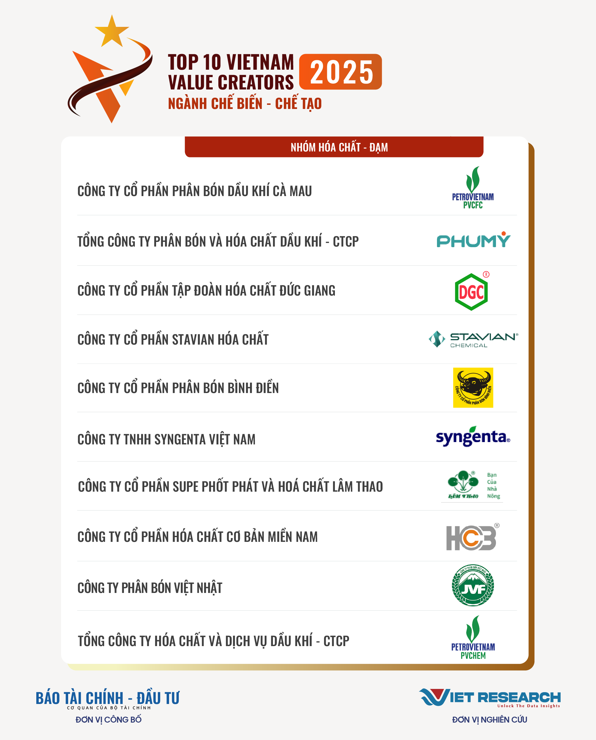 Trong khuôn khổ Chương trình Nghiên cứu toàn quốc về các Doanh nghiệp tạo giá trị hàng đầu Việt Nam, Viet Research phối hợp với Báo Tài chính – Đầu tư (Bộ Tài chính) công bố Top 10 Doanh nghiệp tạo giá trị hàng đầu Việt Nam 2025 – Ngành Chế biến – Chế tạo. Đây là những doanh nghiệp tiên phong trong việc tạo dựng giá trị cho nền kinh tế và xã hội, thể hiện qua: quy mô và tốc độ tăng trưởng; lợi nhuận và đóng góp cho ngân sách; môi trường, chính sách và phúc lợi lao động; cam kết về ESG và đổi mới sáng tạo.
