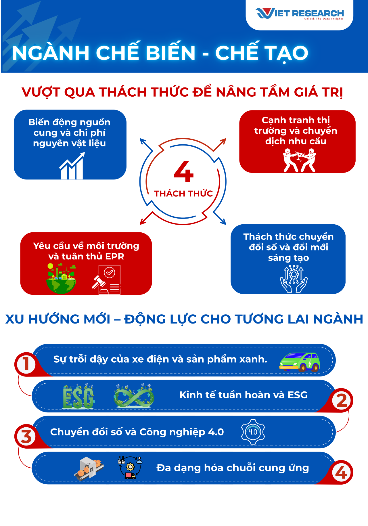 Có 4 thách thức chính theo khảo sát và nghiên cứu Top 10 Doanh nghiệp tạo giá trị hàng đầu Việt Nam 2025 – Ngành Chế biến – Chế tạo do Viet Research thực hiện.